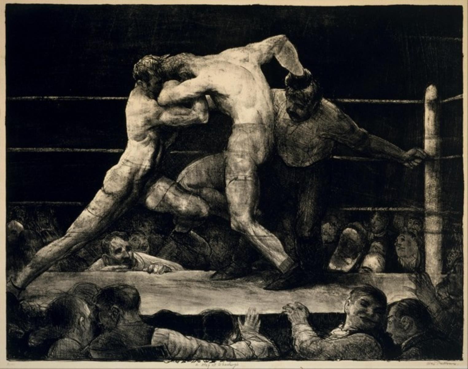 Artist: George Bellows - Title: A Stag at Sharkeys - Medium: Fine Art Giclee on Canvas - Image Size: Approximately 15.75 inches x 20 inches - Framed: Unframed on Unstretched Canvas - Biography: Paintings and prints by George Bellows are in the collections of many major American art museums, including the National Gallery of Art in Washington, DC, the Memorial Art Gallery of the University of Rochester, Rochester, New York, and the Whitney and the Museum of Modern Art in New York. The Columbus Museum of Art in Bellows' hometown also has a sizeable collection of both his portraits and New York street scenes.