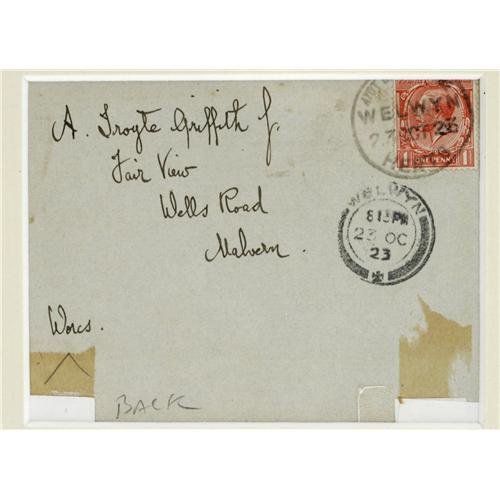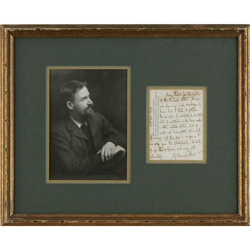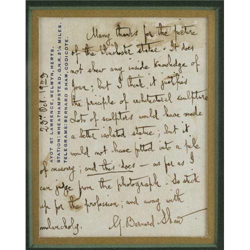 <B>George Bernard Shaw Autograph Note Signed</B></I> "<I>G. Bernard Shaw</B></I>". Irish playwright and winner of the Nobel Prize for Literature in 1925. One page, 3.25" x 4.25", personal note card, Hertfordshire, October 23, 1923, to architect A. Troyte Griffith of Malvern. It reads, in part: "<I>Many thanks for the picture of the Winchester statue. It does not show any inside knowledge of Joan; but I think it justifies the principle of architectural sculpture...So stick up for the profession; and away with melancholy.</B></I>" The statue Shaw mentions is at Winchester Cathedral and was dedicated in 1923, the same year that Shaw published a play titled <I>Joan of Arc</B></I>; this was shortly after the Catholic Church canonized Joan of Arc in 1920. Troyte was a close friend and associate of Edward Elgar who named the 7th Variation of his "Enigma" Variations "Troyte" after him and his incompetent attempts to play the piano. The note has some light staining but is otherwise fine. It is double matted with a portrait and framed to an overall size of 15.25" x 12.25". The addressed verso of the card is visible through a cutout in the back of this double sided mat and frame.