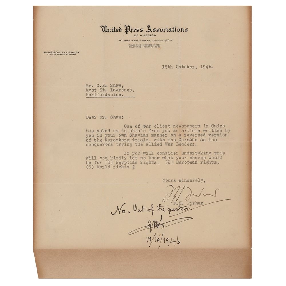ANS signed “GBS,†penned at the bottom of a typed letter from F. H. Fisher of the United Press Associations, one page, 8 x 10, October 17, 1946. Salisbury's letter to George Bernard Shaw, in part: "One of our client newspapers in Cairo has asked us to obtain from you an article written by you in your own Shavian manner on a reversed version of the Nuremberg trials, with the Germans as the conquerors trying the Allied War Leaders." Shaw's terse response: "No. Out of the question," who signs below with his initials and adds the date. In very good to fine condition, with light creasing, and toning to the edges.