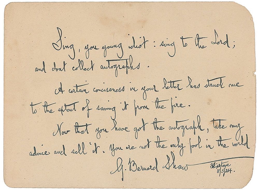 ANS signed “G. Bernard Shaw,” one page, 5.25 x 4, May 8, 1924. Opinionated note to an autograph seeker. In full: “Sing, you young idiot: sing to the Lord; and don’t collect autographs. A certain conciseness in your letter has struck me to the extent of saving it from the fire. Now that you have got the autograph, take my advice and sell it. You are not the only fool in the world.” A central vertical fold passing through a single letter of the signature and some scattered toning, otherwise fine condition. A humorous note demonstrating Shaw’s characteristic sharp wit.