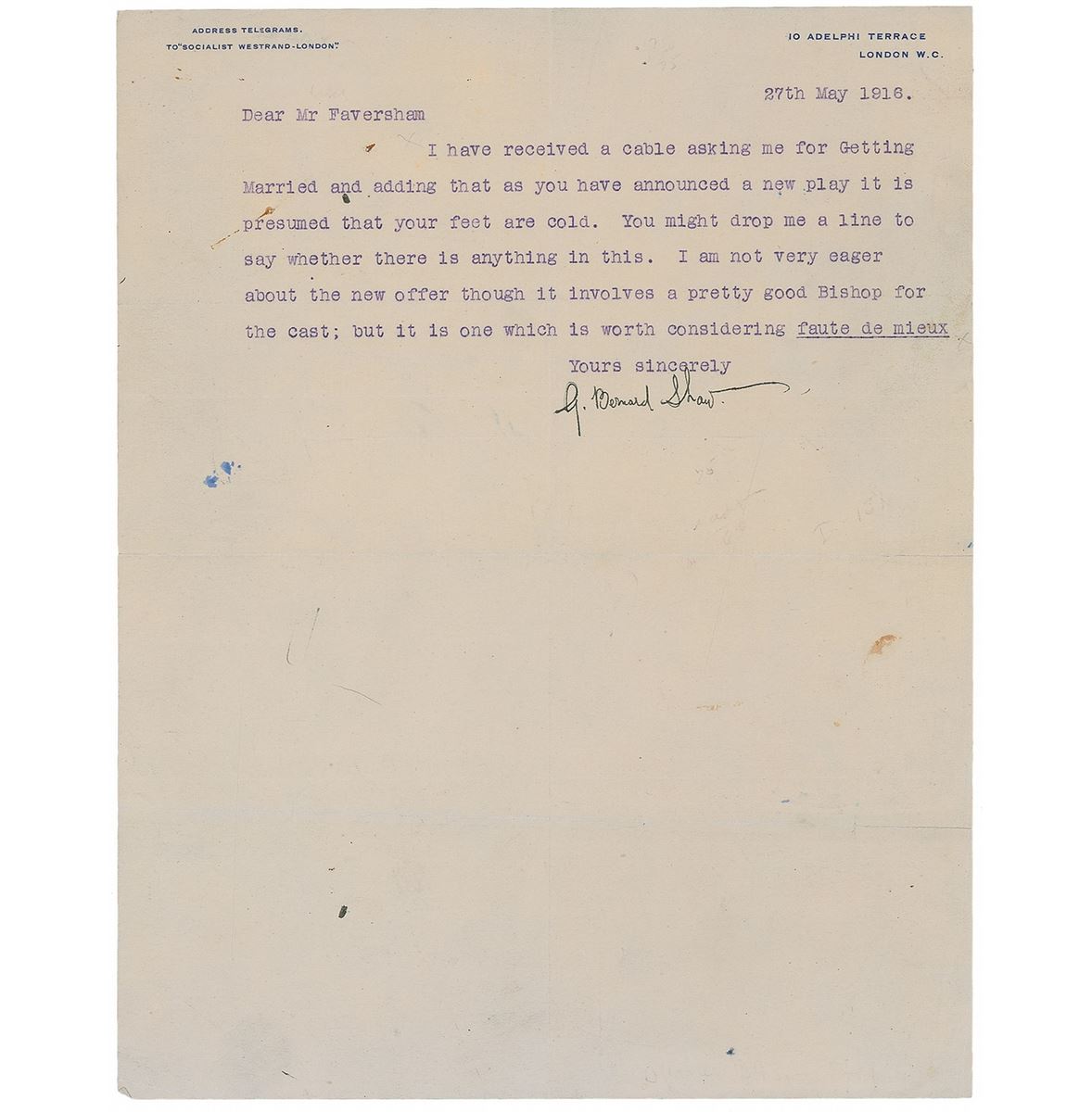 TLS signed “G. Bernard Shaw,” one page, 8 x 10, personal letterhead, May 27, 1916. Letter to actor William Faversham. In full: “I have received a cable asking me for Getting Married and adding that as you have announced a new play it is presumed that your feet are cold. You might drop me a line to say whether there is anything in this. I am not very eager about the new offer though it involves a pretty good Bishop for the cast; but it is one which is worth considering faute de mieux.” Intersecting folds (a horizontal fold unobtrusively bisecting the signature), and trivial scattered staining, otherwise fine condition. Shaw’s comedy ‘Getting Married’ opened on Broadway at the Booth Theatre on November 6, 1916, produced and staged by William Faversham who appeared in the play as the Bishop.