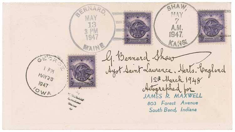 Mailing envelope, 6.5 x 3.75, signed in black ink, “G. Bernard Shaw, Ayot Saint Lawrence. Herts. England. 12th March 1948, autographed for” above a stamped address. Envelope also bears three May 1947 postmarks from George, Iowa; Bernard, Maine; and Shaw, Kansas. In fine condition. Pre-certified PSA/DNA and RRAuction COA.