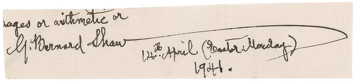 Ink signature, “G. Bernard Shaw, 14th April (Easter Monday), 1941,” on an off-white 4.5 x 1 slip clipped from the closing of a letter. In fine condition, with a couple of words in Shaw’s hand above signature and a vertical fold through a single letter of signature. RRAuction COA.