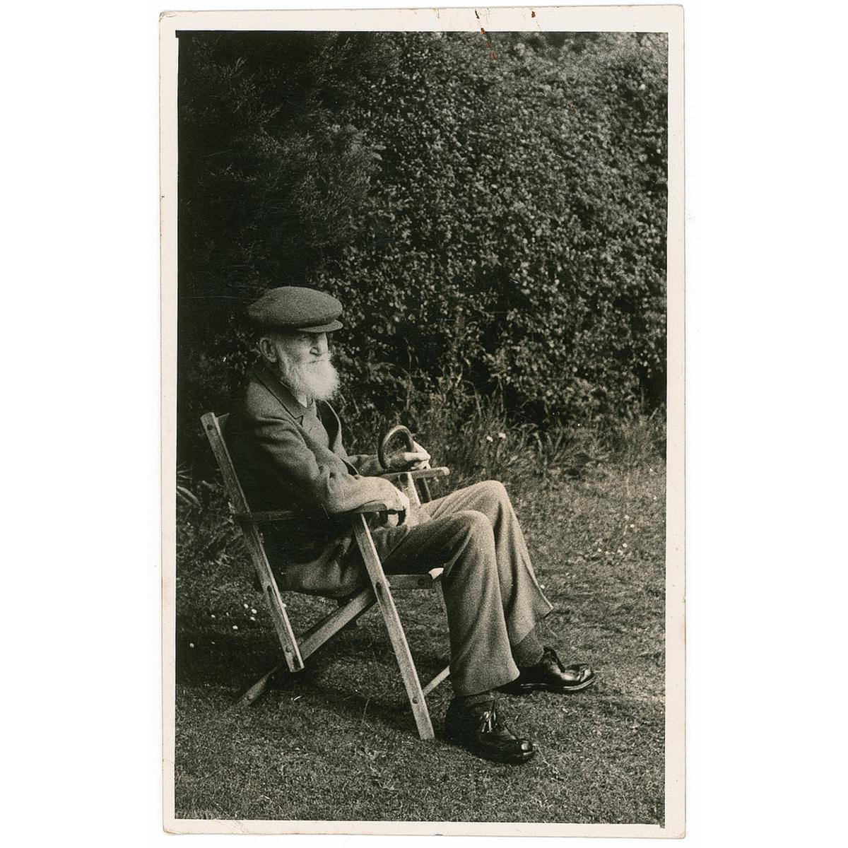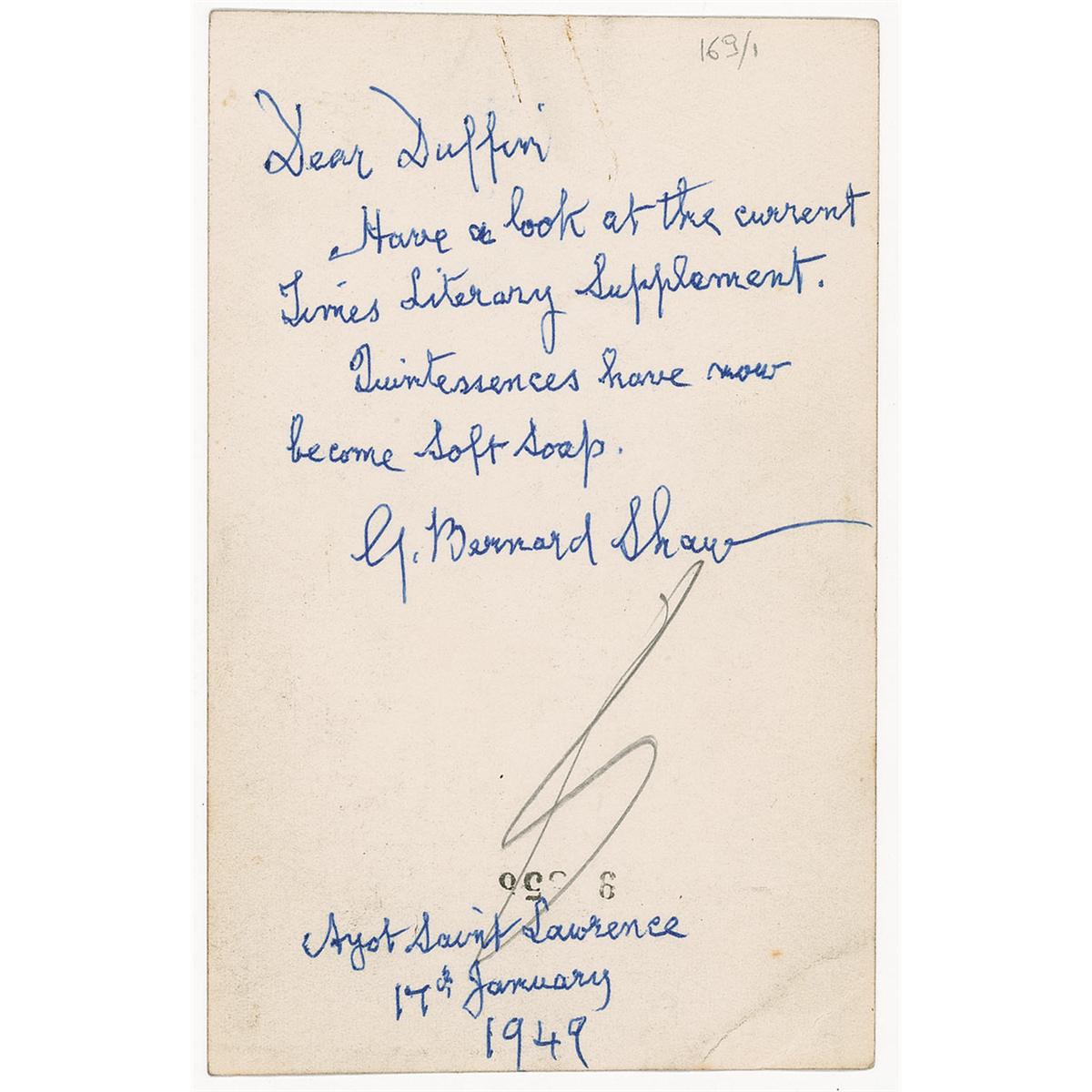 ALS signed “G. Bernard Shaw,” on the correspondence side of a 3.5 x 5.5 picture postcard of Shaw, dated January 17, 1949. Brief letter to the author of his biography, Henry Charles Duffin, written while in Ayot Saint Lawrence. In full: “Have a look at the current Times Literary Supplement. Quintessences have now become soft soap.” In fine condition, with rusty paperclip mark to letter side, a crease to lower right corner, and silvering and surface marks to image side. Accompanied by a typed manuscript of correspondence between Shaw and Duffin from between 1919 and 1922, the galley proofs of “Quintessence,” with several corrections and notations in Shaw’s hand.