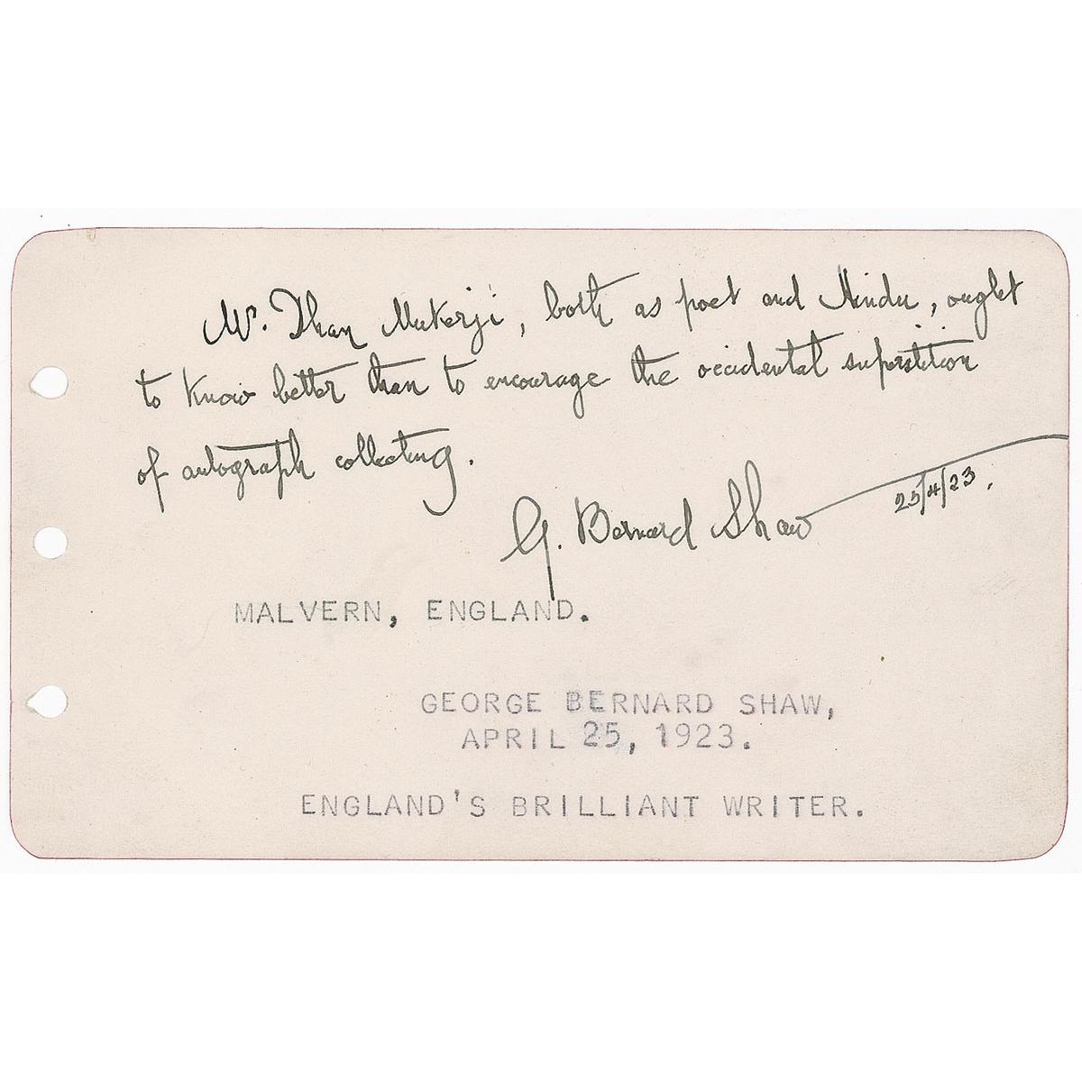 Brief ALS signed “G. Bernard Shaw,” one page, 5 x 3, April 25, 1923. Brief letter to Indian author Dhan Gopal Mukerji. In full: “Mr. Dhan Mukerji, both as poet and Hindu, ought to know better then to encourage the occidental superstition of autograph collecting.” Typed collector’s notations have been added to the bottom of the page In fine condition, with three punch holes to left edge.
