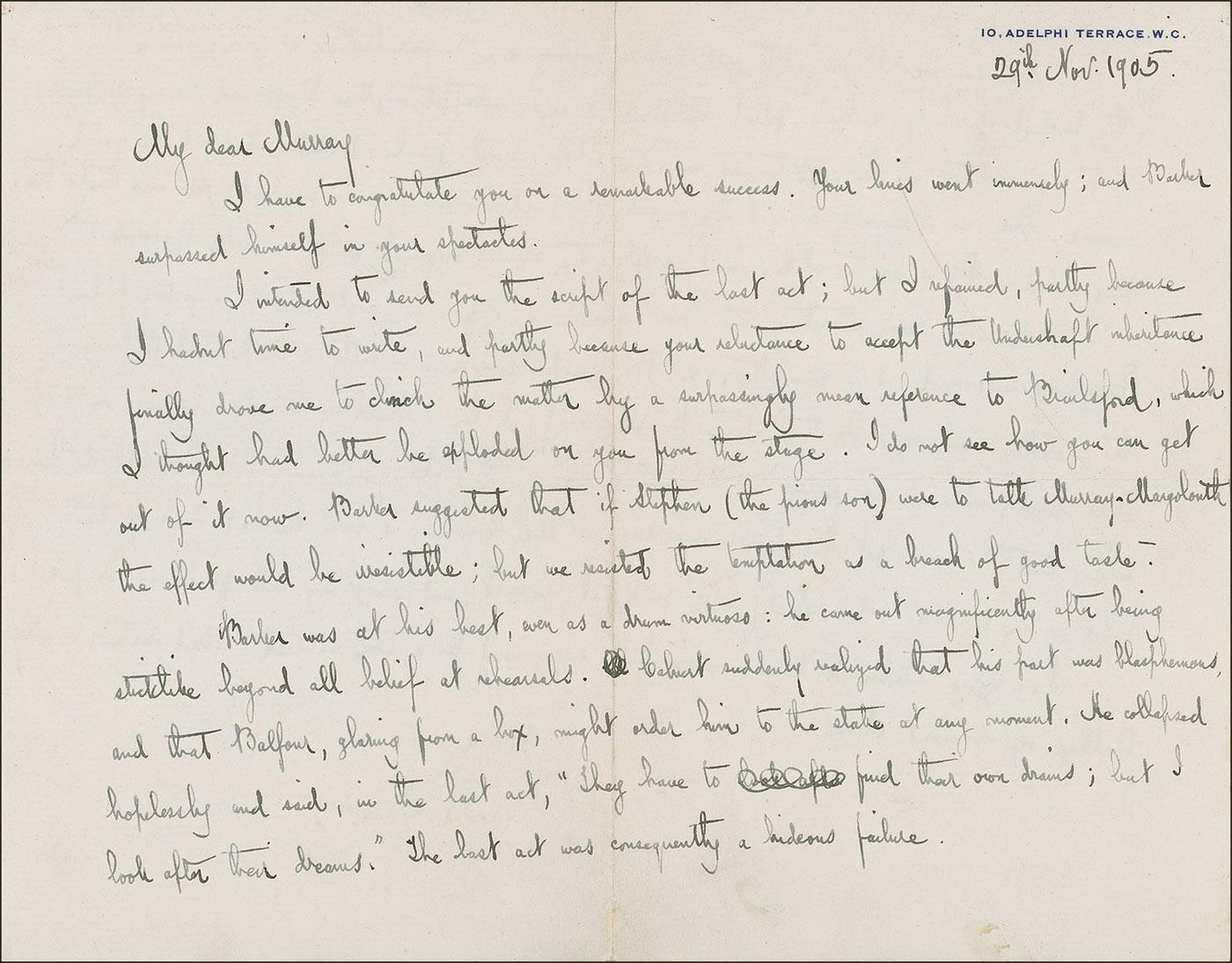 One of the literary world’s most famous playwrights here writes his friend Murray, one of the most well-respected scholars of the era, whom he had been consulting on the work; the title character is engaged to the character of Cusins, who like Murray is a scholar of Greek literature. Specifically, Shaw addresses the premise that Major Barbara Undershaft of the Salvation Army would vehemently oppose accepting a donation from her estranged father, a wealthy arms manufacturer. “I intended to send you the script of the last act; but I refrained...partly because your reluctance to accept the Undershaft inheritance finally drove me to clinch the matter by a surpassingly mean reference to Brailsford,” Shaw writes, also mentioning Granville-Barker, who co-produced the original British production and starred as Cusins. The playwright later wrote a preface for the play's publication reinforcing his belief that donations can always be used for good, regardless of origin. He also continuously praised Murray for helping influence the work—something apparent on this page.