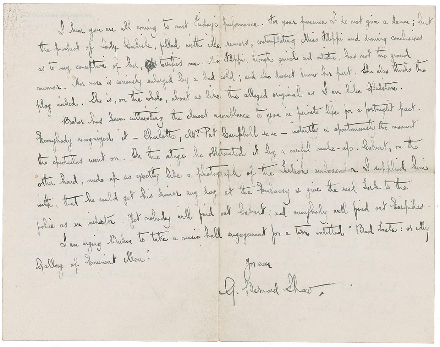 ALS signed “G. Bernard Shaw,” one page both sides, 9 x 7, November 29, 1905. Writing to Gilbert Murray, British scholar who served as the basis for the character Adolphus Cusins in the play Major Barbara, discussed here. In part: “I intended to send you the script of the last act; but I refrained, partly because I hadn’t time to write, and partly because your reluctance to accept the Undershaft inheritance finally drove me to clinch the matter by a surpassingly mean reference to Brailsford, which I thought had better be exploded on you from the stage. I do not see how you can get out of it now. [Harley Granville] Barker suggested that if Stephen [Undershaft] (the pious son) were to talk Murray-Margolouth the effect would be irresistible; but we resisted the temptation as a breach of good taste.