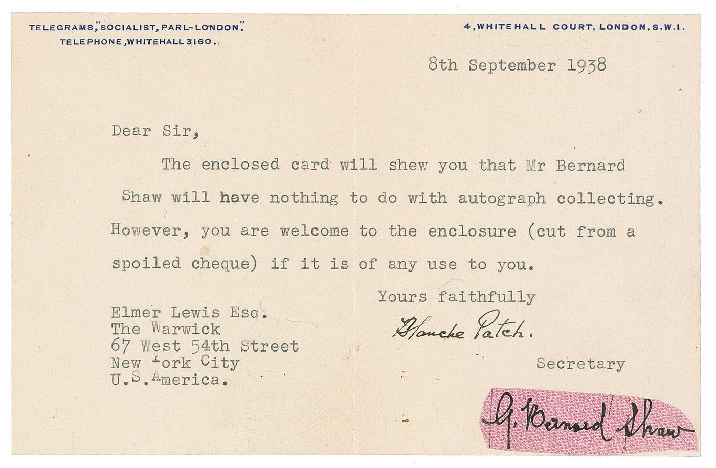 Ink signature, “G. Bernard Shaw,” on a light red 2.25 x .75 slip clipped from a check. Slip is affixed to a 7 x 4.5 TLS from Shaw’s secretary, dated September 8, 1938, stating: “Mr. Bernard Shaw will have nothing to do with autograph collecting. However, you are welcome to the enclosure (cut from a spoiled cheque).” In fine condition, with a central vertical fold to letter.