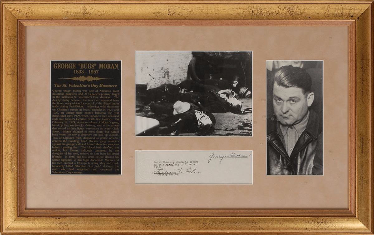 Partial DS, signed “George Moran,” one page, 7.75 x 2.25, November 28, 1938. Signed in the upper right by Moran, and countersigned by a notary public. Matted and framed with an image of Moran and the aftermath of the St. Valentine’s Day massacre, as well as an engraved plaque retelling the bloody event to an overall size of 25.5 x 16. In fine condition. Signed less than two years after Moran and his men wrought vengeance on Machine Gun Jack McGurn, one of the organizers of the St. Valentine's Day Massacre, this document bears a crisp, neat signature from the seldom-encountered Moran—only the third instance in which we’ve offered the notorious Chicago Prohibition-era gangster.