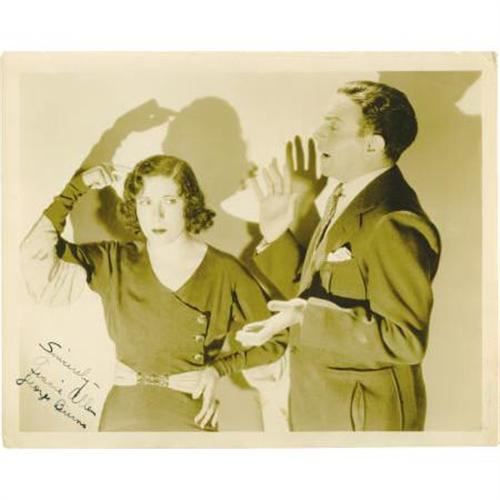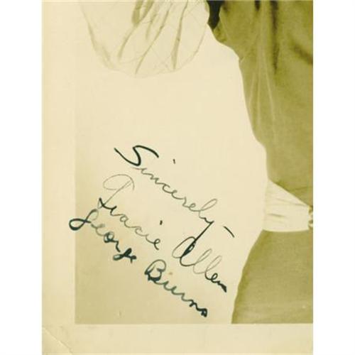 <B>George Burns and Gracie Allen Autographed Portrait.</B></I> A wonderful 8 x10 still of the beloved husband-and-wife comedy team (married from 1926 until Gracie's death in 1964), probably from the early 1930s era when these stars were on contract to Paramount Studios. The legendary duo signed in black ink in the lower left corner, "Sincerely - Gracie Allen George Burns." George appears (as was his custom) epically exasperated, and Grace's pose - pointing at her head, as if indicating her laugh-reaping intellect - is especially charming. Stars of vaudeville, radio, movies, and TV, they had a marital record as legendary as their professional careers; when George died (at age 100!) in 1996, he was buried under Gracie's crypt, claiming he now wanted her to have "top billing." There is some minor creasing, especially in the upper right border, extending slightly over an inch into the picture area (not touching George's toupee); overall Very Fine condition. "Say goodnight, Gracie!" .<BR><BR><b>Shipping:</b> Flat Material, Small (<a target="_blank" href="http://www.heritageauctions.com/common/shipping.php">view shipping information</a>)