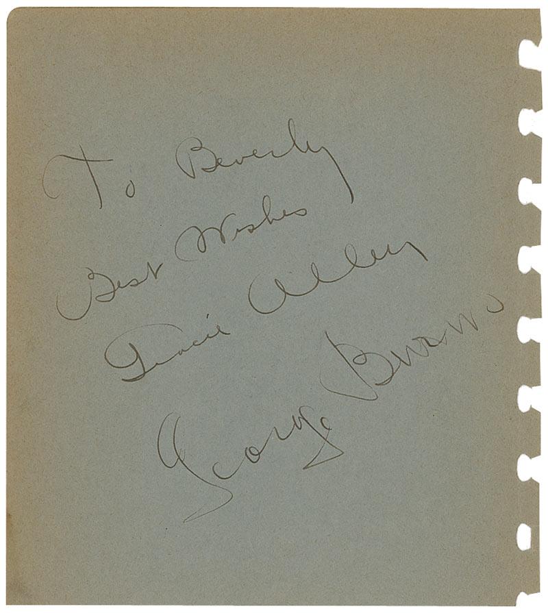 Vintage fountain pen signatures, “To Beverly, Best wishes, Gracie Allen,” and “George Burns,” on a gray 5.75 x 6.5 album page. In fine condition, with mild edge toning, and a rough right edge from removal from album.