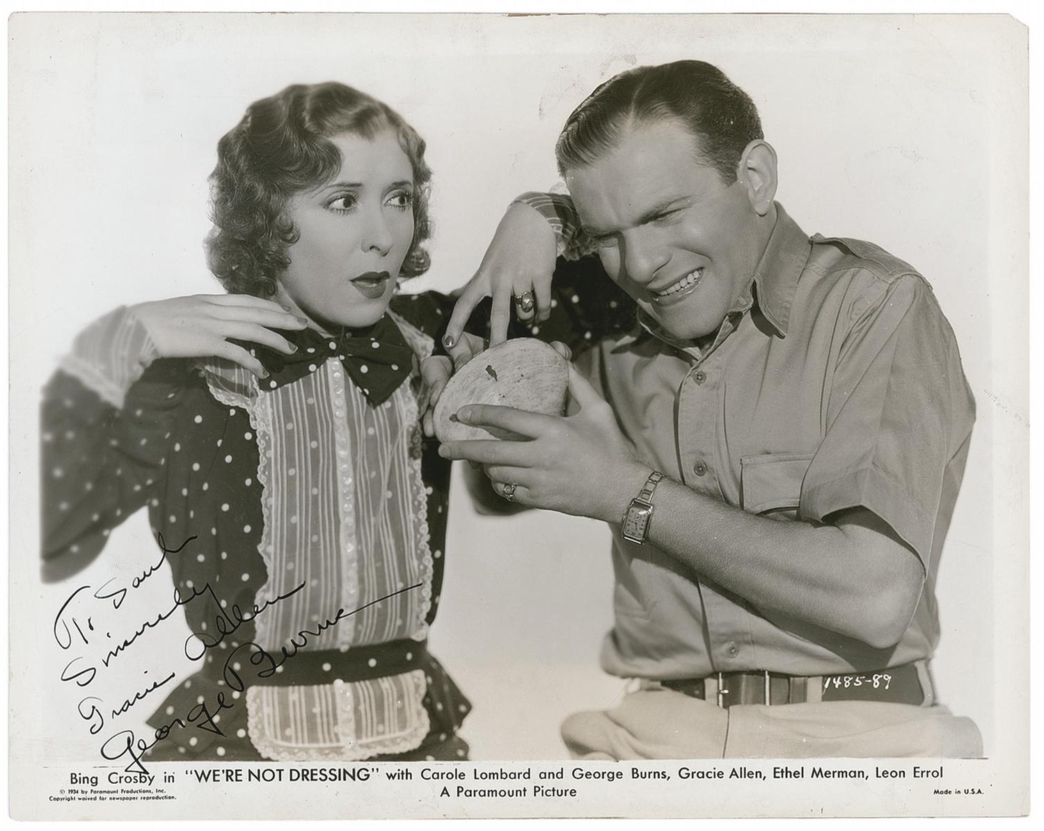 Vintage glossy 10 x 8 Paramount promotional photo for We’re Not Dressing, signed and inscribed in-person in fountain pen “To Saul, Sincerely, Gracie Allen,” and “George Burns.” Reverse of photo bears collector’s stamp date of November 14, 1934, the date the signatures were acquired. In very good condition, with scattered creases and surface marks, impressions from mounting remnants on reverse, some scattered light toning and soiling, and some light rubbing to emulsion. Saul Goodman Collection.