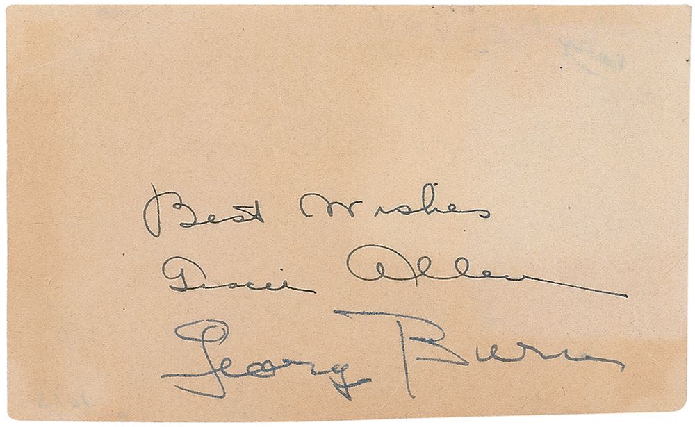 Vintage ink signatures, “Best wishes Gracie Allen,” and “George Burns,” on an off-white 4.75 x 2.75 sheet. In very good condition, with moderate toning over portions of both signatures and sentiment.