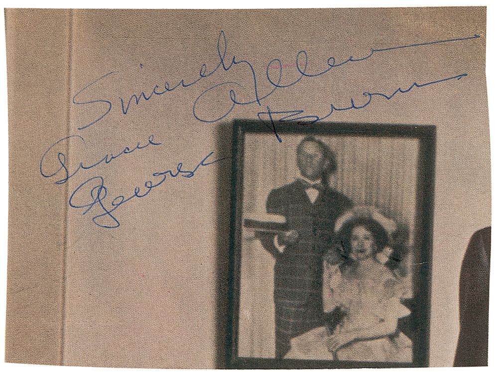 Vintage ballpoint signatures, “Sincerely, Grace Allen” and “George Burns,” on a clipped 4.5 x 3.5 magazine photo, affixed to a piece of same-size cardstock. In fine condition.