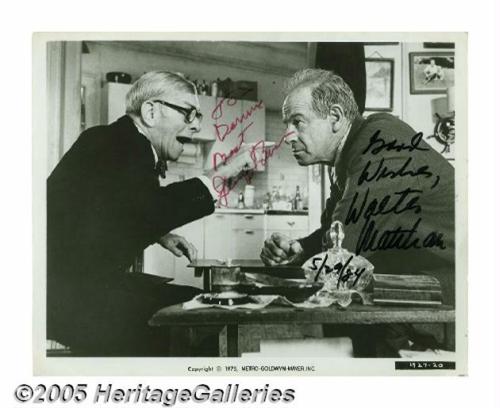 <B>George Burns and Walter Matthau Signed Photograph.</B></I> Here's a 10" x 8" black and white publicity still for the 1975 comedy "The Sunshine Boys" signed by actors George Burns in red marker and Walter Matthau in black marker, in superb condition. Burns won an Oscar for Best Supporting Actor, and Matthau was nominated for Best Actor for their performances in the film. <I>With COA from PSA/DNA.</B></I>