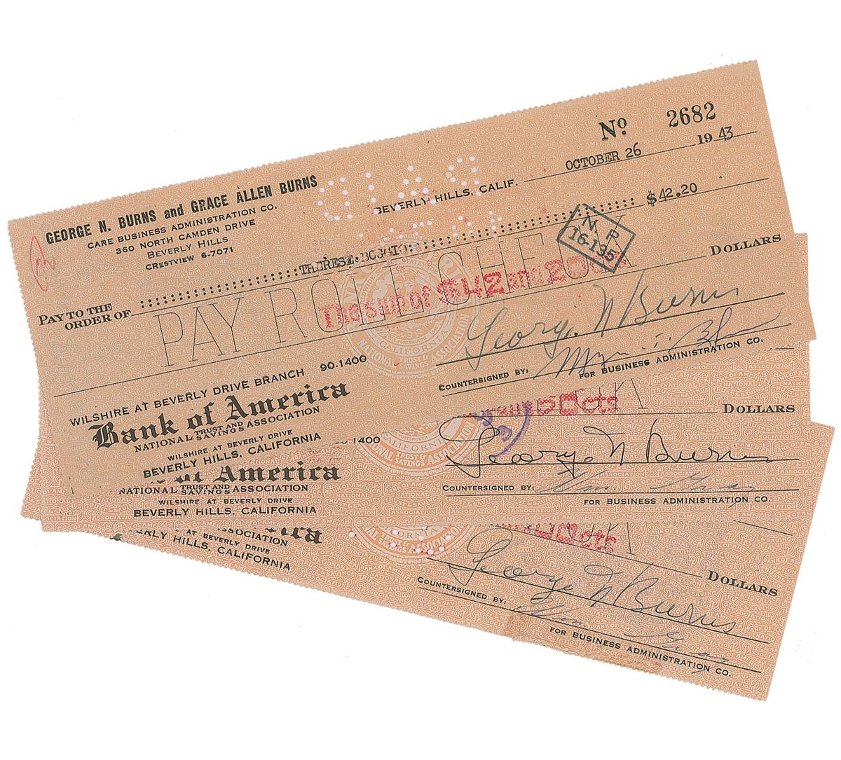 Three personal checks, all 8 x 3, all filled out in type and signed by Burns, “George N. Burns,” all dated from 1942–1943. In fine condition, with expected stamps, holes, and folds, lightly affecting two of the signatures.