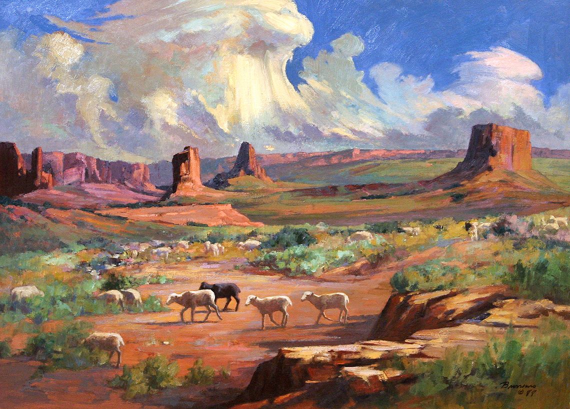 George Burrows (?-1994). The Skies Over Monument Valley. 30" x 40" oil on canvas. Signed lower right: Burrows © 88. (est. $2,500-3,500). CONDITION REPORTS: www.auctioninsantafe.com/docs/cr2012.pdf