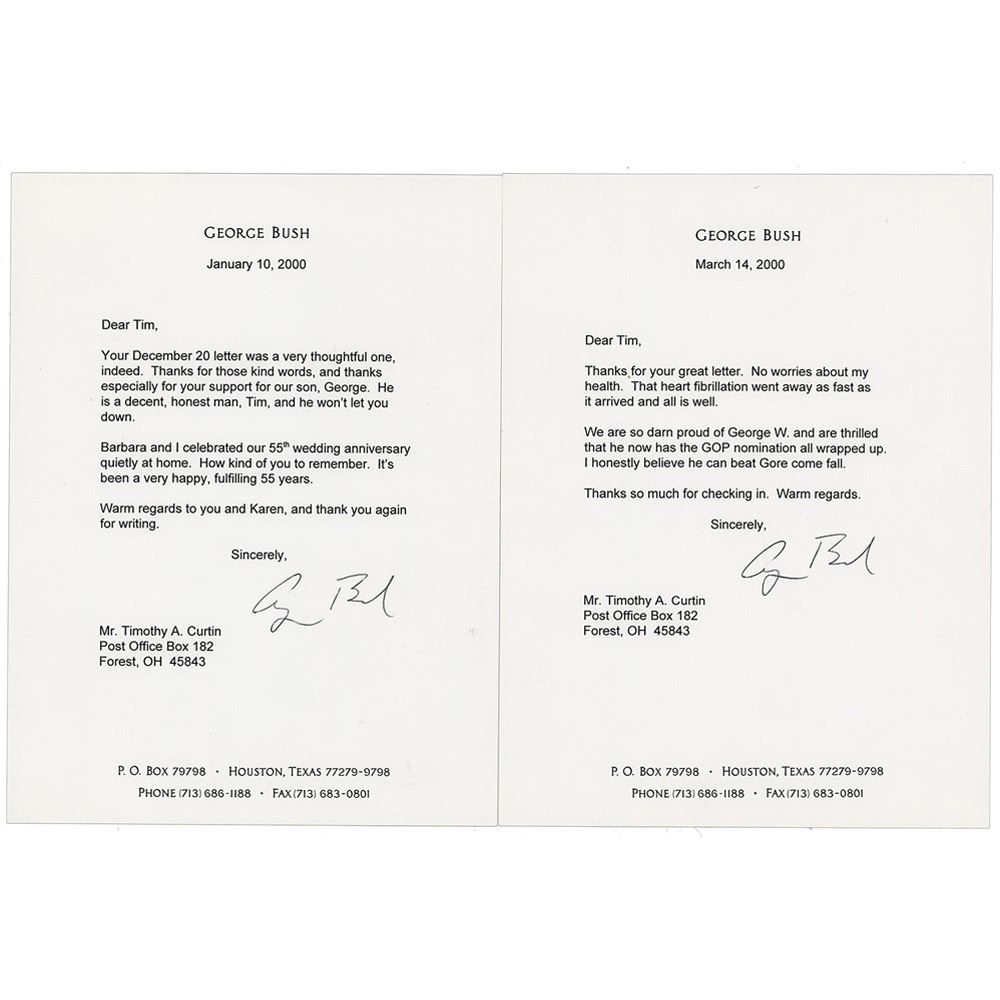 Two TLSs from George Bush, both one page, 6.5 x 8.5, personal letterhead, January 10 and March 14, 2000, addressed to Timothy A. Curtin. The earlier letter, in part: “Thanks for those kind words, and thanks especially for your support for our son, George. He is a decent, honest man, Tim, and he won’t let you down.” The second letter: “No worries about my health. That heart fibrillation went away as fast as it arrived and all is well. We are so darn proud of George W. and are thrilled that he now has the GOP nomination all wrapped up. I honestly believe he can beat Gore come fall.” In overall very fine condition.
