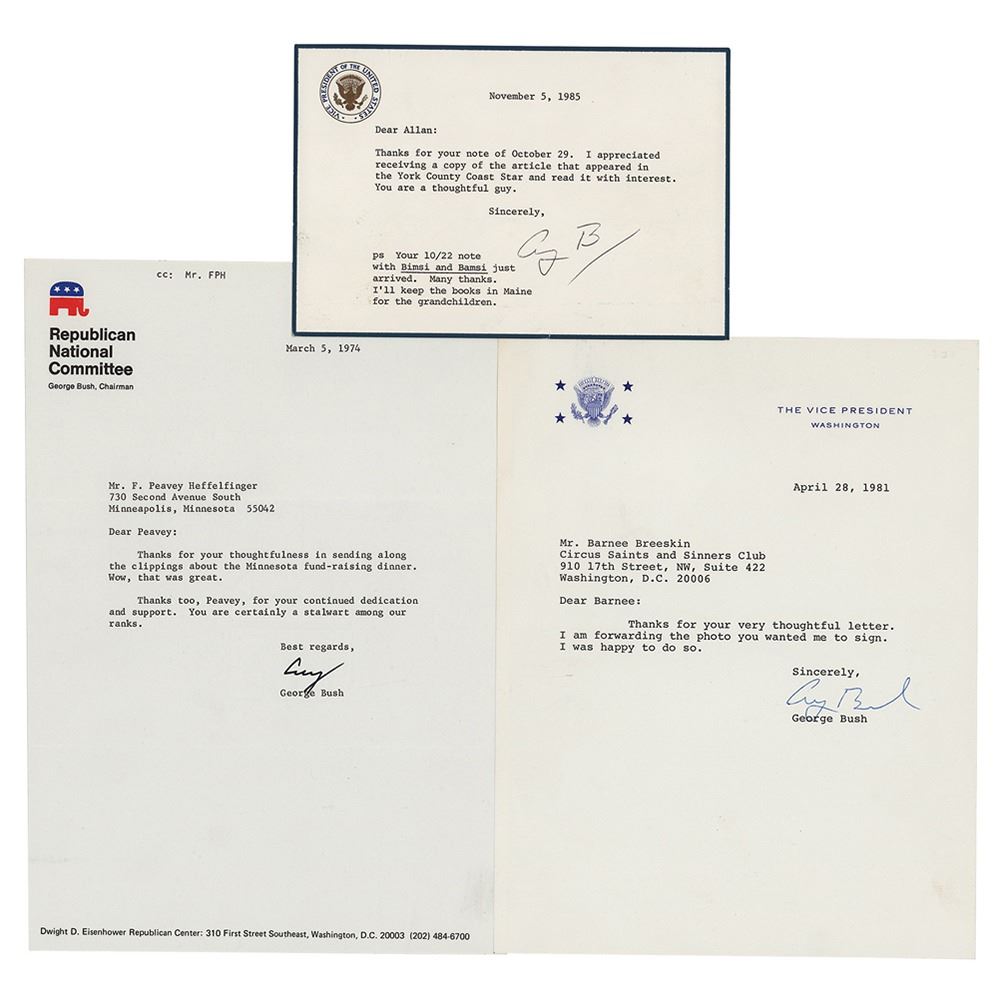 Three TLSs signed “George,†“George B.,†or “George Bush†as either Vice President or as Chairman of the Republican National Committee, each one page, ranging in size from 6.25 x 4.25 to 7 x 10. The earliest letter, March 5, 1974, thanks F. Peavey Heffelfinger for his “thoughtfulness in sending along the clippings about the Minnesota fund-raising dinner.†The second, April 28, 1981, forwards a photo with his thanks; and the third, November 5, 1985, thanks “Allan†for sending an article from the York County Coast Star, adding in a postscript: “Your 10/22 note with Bimsi and Bamsi just arrived. Many thanks. I’ll keep the books in Maine for the grandchildren.†In overall fine condition.