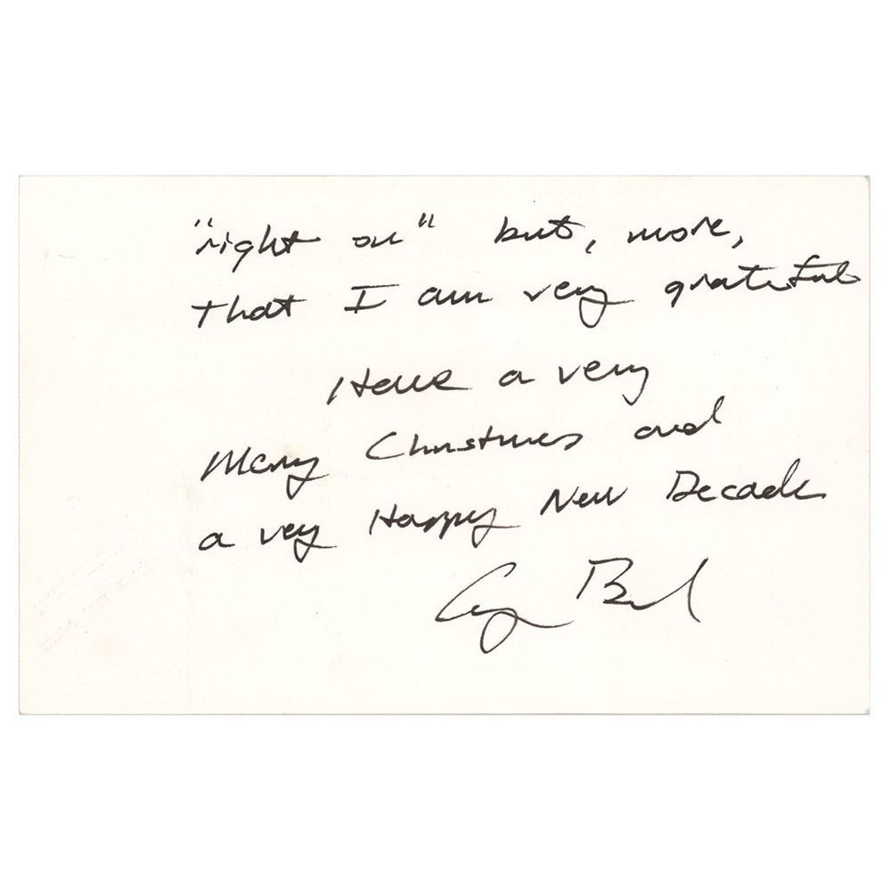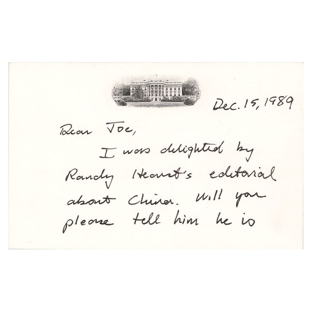 ALS as president, one page both sides, 6.5 x 4, engraved White House stationery card letterhead, December 15, 1989. Handwritten letter to an unknown recipient named "Joe," in full: "I was delighted by Randy Hearst's editorial about China. Will you please tell him he is 'right on' but, more, that I am very grateful. Have a very Merry Christmas and a very Happy New Decade." In very fine condition.