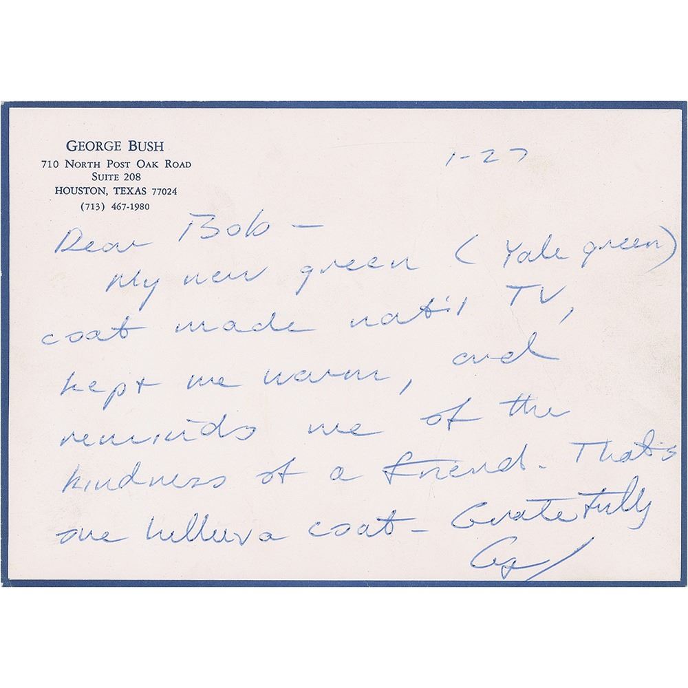 ALS signed “George,” one page on a 6.25 x 4.5 personal stationery card, January 27. Letter to Robert Clark, in full: "My new green (Yale Green) coat made nat'l TV, kept me warm, and reminds me of the kindness of a friend. That's one helluva coat." In very good to fine condition, with a diagonal crease to the right side. Accompanied by the original mailing envelope.
