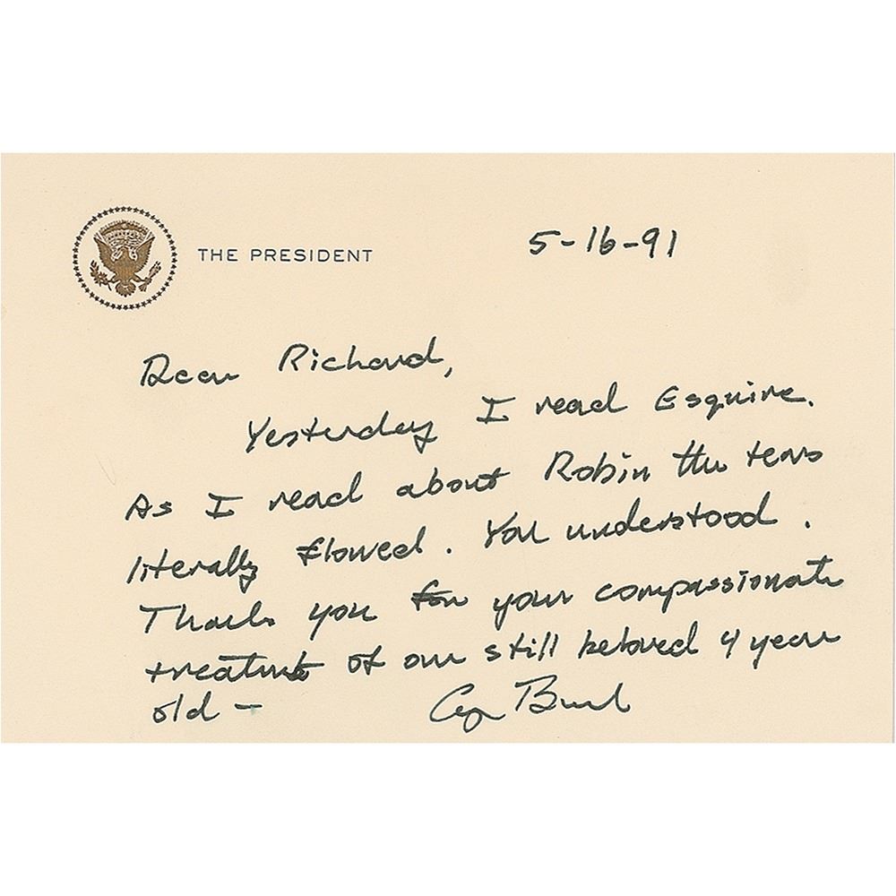 ALS as president signed “George Bush,†one page on a 6.25 x 4.25 presidential stationery card, May 16, 1991. Letter to Pulitzer Prize–winning journalist Richard Ben Cramer, about his article 'How He Got Here.' In full: "Yesterday I read Esquire. As I read about Robin the tears literally flowed. You understood. Thank you for your compassionate treatment of our still beloved 4 year old." In very fine condition.