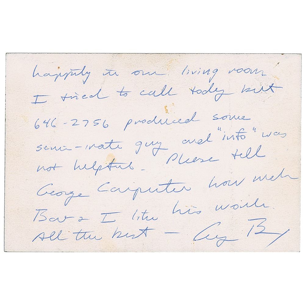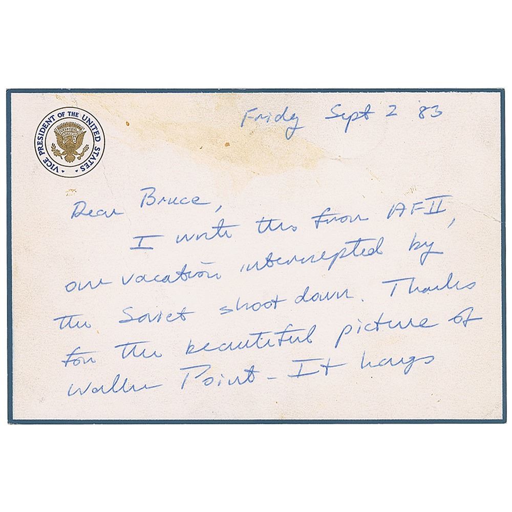 ALS, one page both sides, 6.25 x 4.25, vice presidential letterhead, September 2, 1983. Letter to "Bruce," in full: "I write this from AFII, our vacation interrupted by the Soviet shoot down. Thanks for the beautiful picture of Wallen Point. It hangs happily in our living room. I tried to call today but 646-2756 produced some semi-irate guy and 'info' was not helpful. Please tell George Carpenter how much Barb & I like his work." In very good to fine condition, with some light creasing, and a stain to the top of the first page. The "Soviet shoot down" refers to the Korean Air Lines Flight 007, shot down by a Soviet Su-15 interceptor on September 1st, resulting in the loss of 269 lives, including 61 Americans. The incident was one of the most tense of the Cold War.