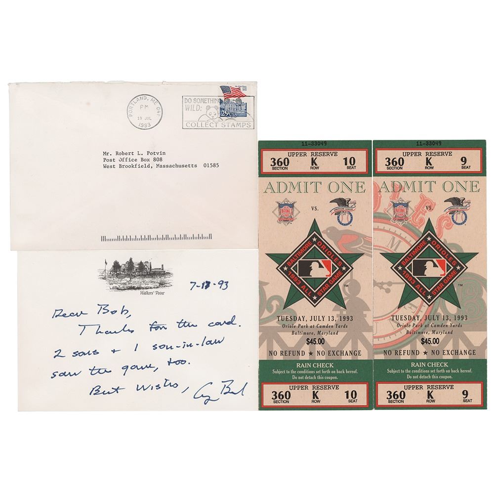 ALS, one page, 6.25 x 4.25, Walker's Point letterhead, July 17, 1993. Handwritten letter to Robert L. Potvin, evidently referencing the 1993 MLB All-Star Game. In full: "Thanks for the card. 2 sons + 1 son-in-law saw the game, too." In fine condition. Accompanied by the original mailing envelope and two ticket stubs from the 1993 All-Star Game, hosted at Camden Yards in Baltimore.