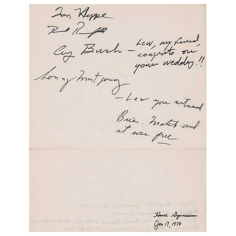 ANS, one page, 7 x 8.5, in full: “George Bush—Lew my friend, congrats on your wedding!!†Also signed by Tom Kleppe, Donald Rumsfeld, and Sonny Montgomery, who adds “Lew you witnessed Brier match and it was free.†Annotated in ink in the lower corner, “House Gymnasium, Jan. 17, 1976.†In fine condition, with light show-through at the bottom from a collector's notations on the back.