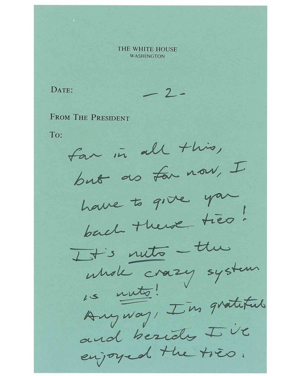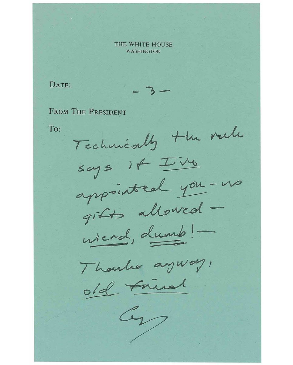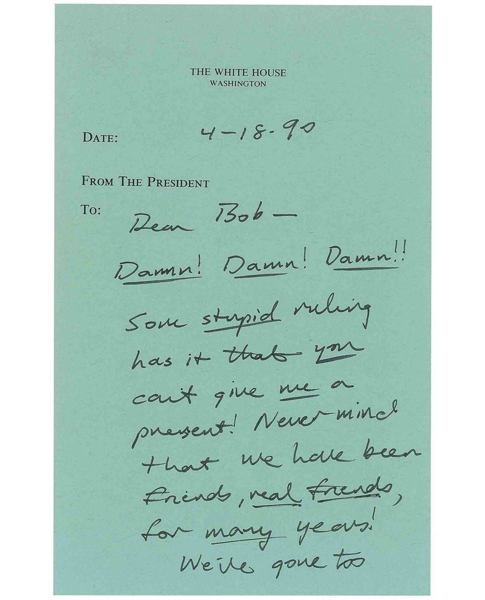 Rare ALS as president signed “George,” three pages, 5.25 x 8.5, White House letterhead, April 18, 1990. Letter to Robert Mosbacher, his secretary of commerce. In full: “Damn! Damn! Damn! Some stupid ruling has it that you can’t give me a present! Never mind that we have been friends, real friends, for many years! We’ve gone too far in all this, but as for now, I have to give you back these ties! It’s nuts—the whole crazy system is nuts! Anyway, I’m grateful and besides I’ve enjoyed the ties. Technically the rule says if I’ve appointed you—no gifts allowed—weird, dumb!” In fine condition, with a staple hole to top left of each page. Mosbacher and Bush had been friends decades before his presidential appointment, working as chief fundraiser for three Bush campaigns, as well as serving on his cabinet. In this particular instance, Secretary Mosbacher, a major player within the Bush administration, had been attending a White House meeting with the president when he received this handwritten letter. This ALS was kept within his folder, along with the meeting’s agenda, however, when the meeting ended, he forgot to take the letter with him. Later, it was retrieved by a White House staffer, who had a place within President Bush’s inner circle, and presented it directly to Raleigh DeGeer Amyx. Bush handwritten letters from his single term as president are quite scarce and rarely offered for auction.