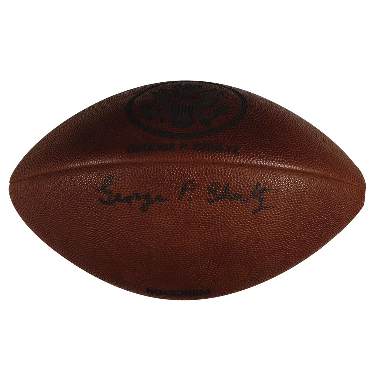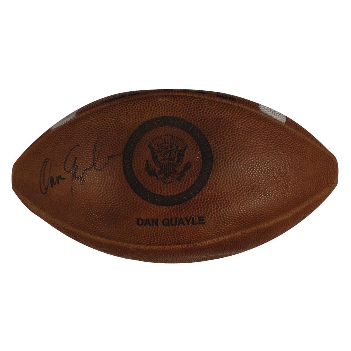 Three official Wilson AFCRT footballs, signed on a side panel in black ink by George Bush, Dan Quayle, and George Schultz respectively, each signing under or near their appropriate seal. In very good condition, with each ball slightly under-inflated, and Bush’s signature light and only partially legible.