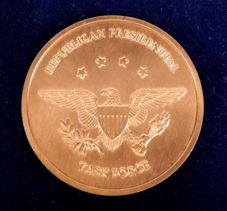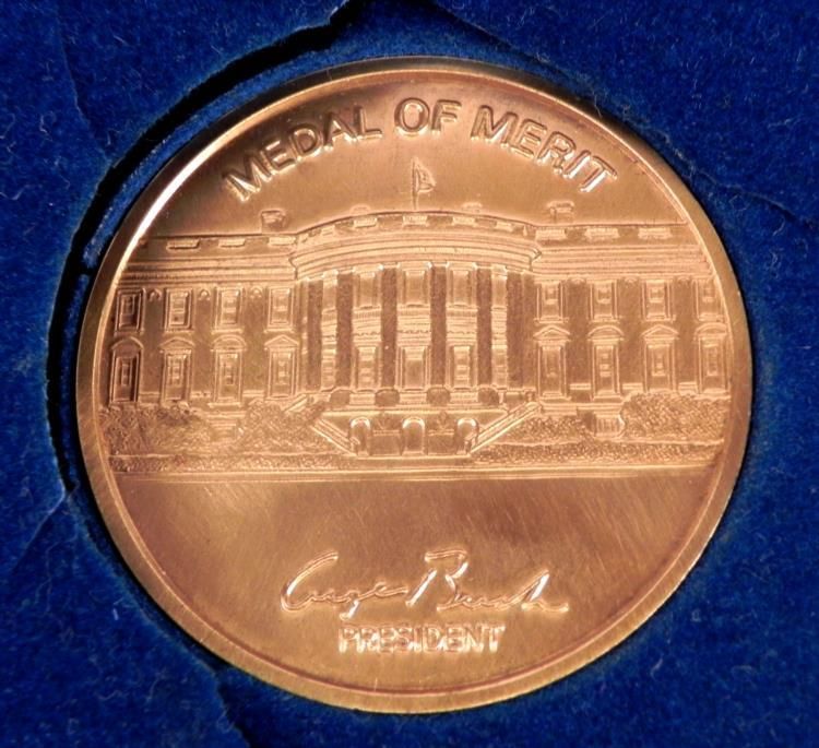 This is a Medal of Merit from the Republican Task Force, during the Bush Senior era. It is in excellent condition. It comes in the original hinged box, which is in good condition, with some cracking on the interior, and dent on top. The inside lid is marked: * "This Medal of Merit has been presented to you in appreciation for your support as a member of the Republican Presidential Task Force"Obverse: "Medal of Merit, George W. Bush, President" with White House * Reverse: "Republican Presidential Task Force" with eagle