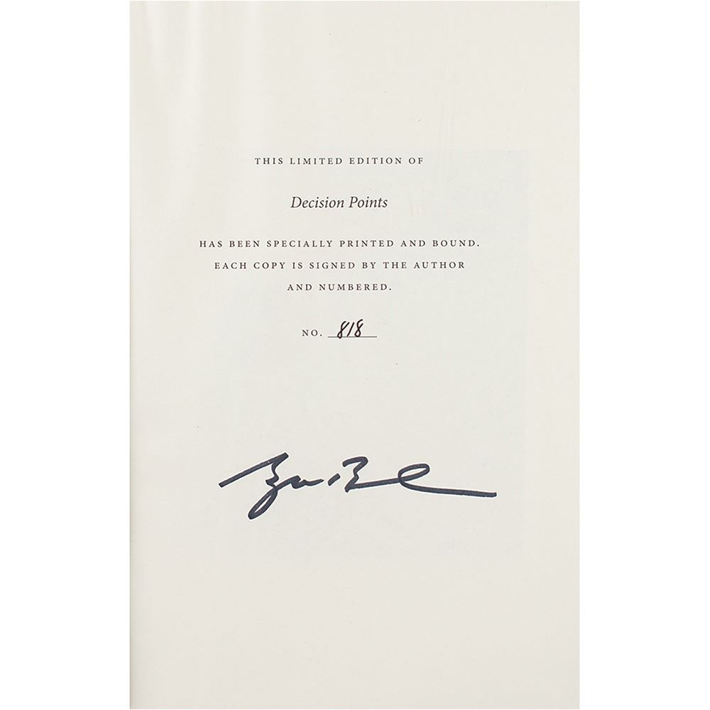 Signed book: Decision Points. Limited first edition, numbered 818. NY: Crown Publishers, 2010. Clothbound hardcover with slipcase, 6.75 x 10, 497 pages. Signed on the colophon in black felt tip by George W. Bush. In very fine condition.