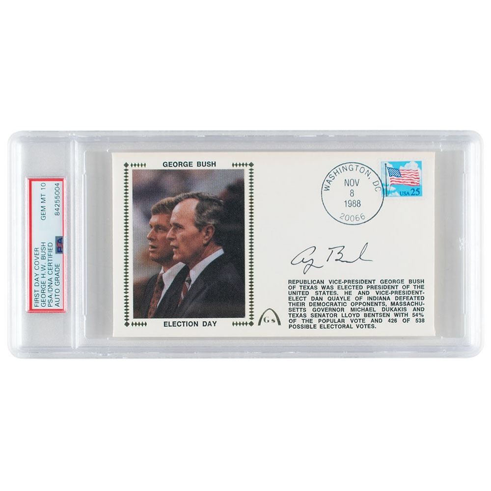Election Day Gateway cover with a silk cachet honoring Republican candidates and eventual winners George Bush and Dan Quayle, postmarked at Washington, D.C. on November 8, 1988, signed in black ink by Bush. In fine condition. Encapsulated in a PSA/DNA authentication holder, grading the autograph as "GEM MT 10."