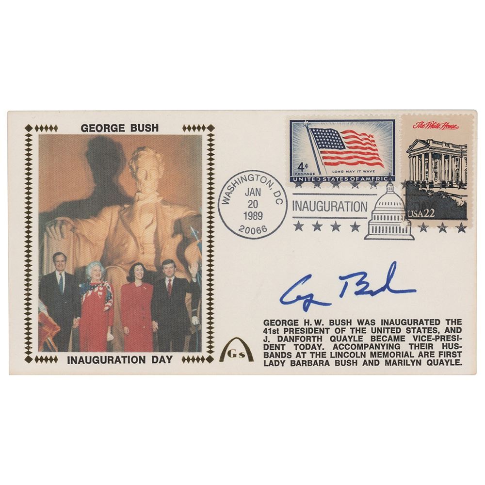 Inauguration Day Gateway cover with a silk cachet honoring the presidential inauguration of George Bush, postmarked at Washington, D.C. on January 20, 1989, signed in blue felt tip. In very fine condition. An attractive and uncommon signed Gateway cover.