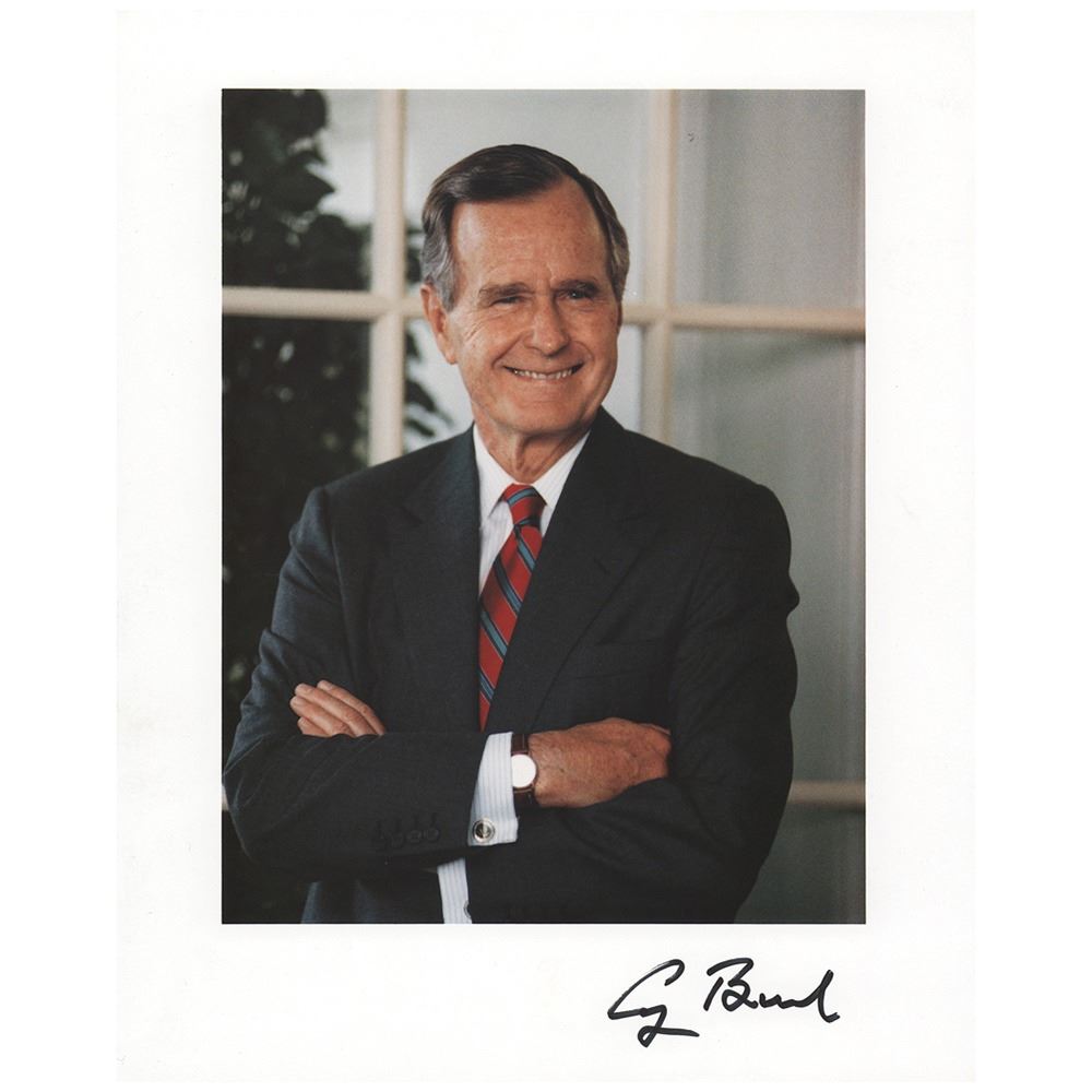 Color 8 x 10 cardstock photo of Bush in a suit and tie, signed in the lower border in black felt tip. In very fine condition.