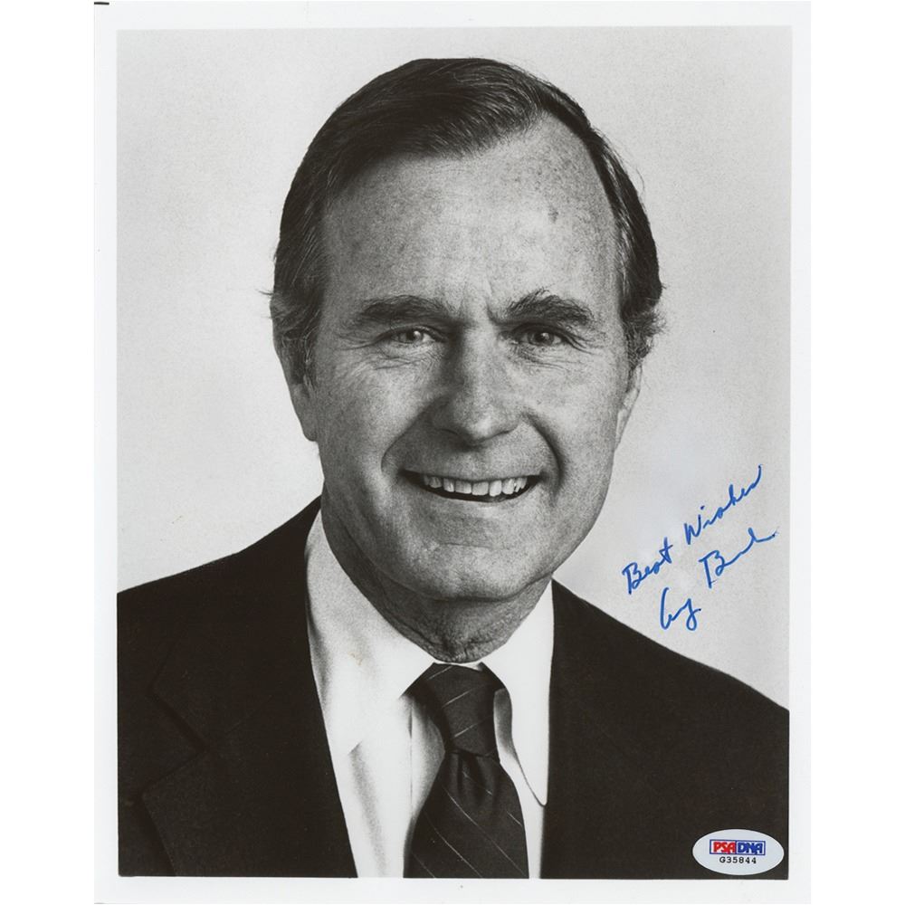 Glossy 8 x 10 close-up photo, signed in blue felt tip, "Best wishes, George Bush." In fine condition, with scattered light surface creases and a PSA/DNA label affixed to the lower right corner (certificate not present).