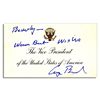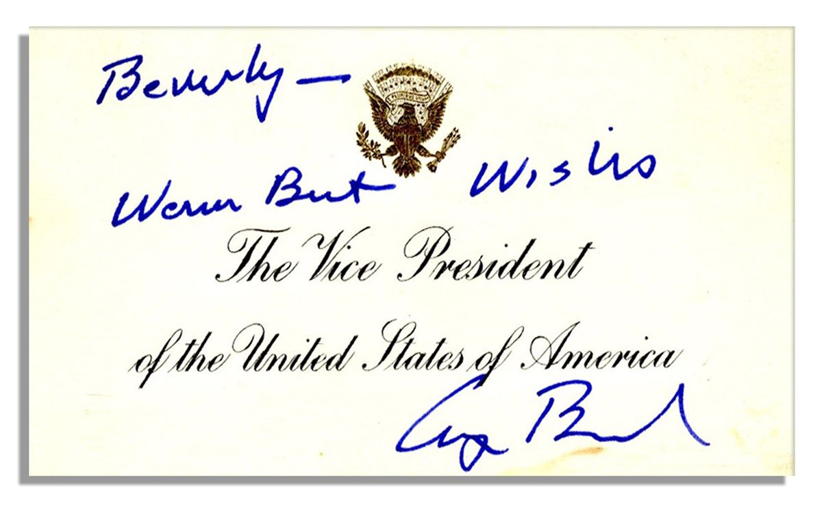 George Bush signed Vice Presidential card with autograph note signed, as VP. Bush dedicated the card to Congressman Bill Young's wife, ''Beverly - Warm best wishes / George Bush''. Measures 3.75'' x 2.25''. Near fine.