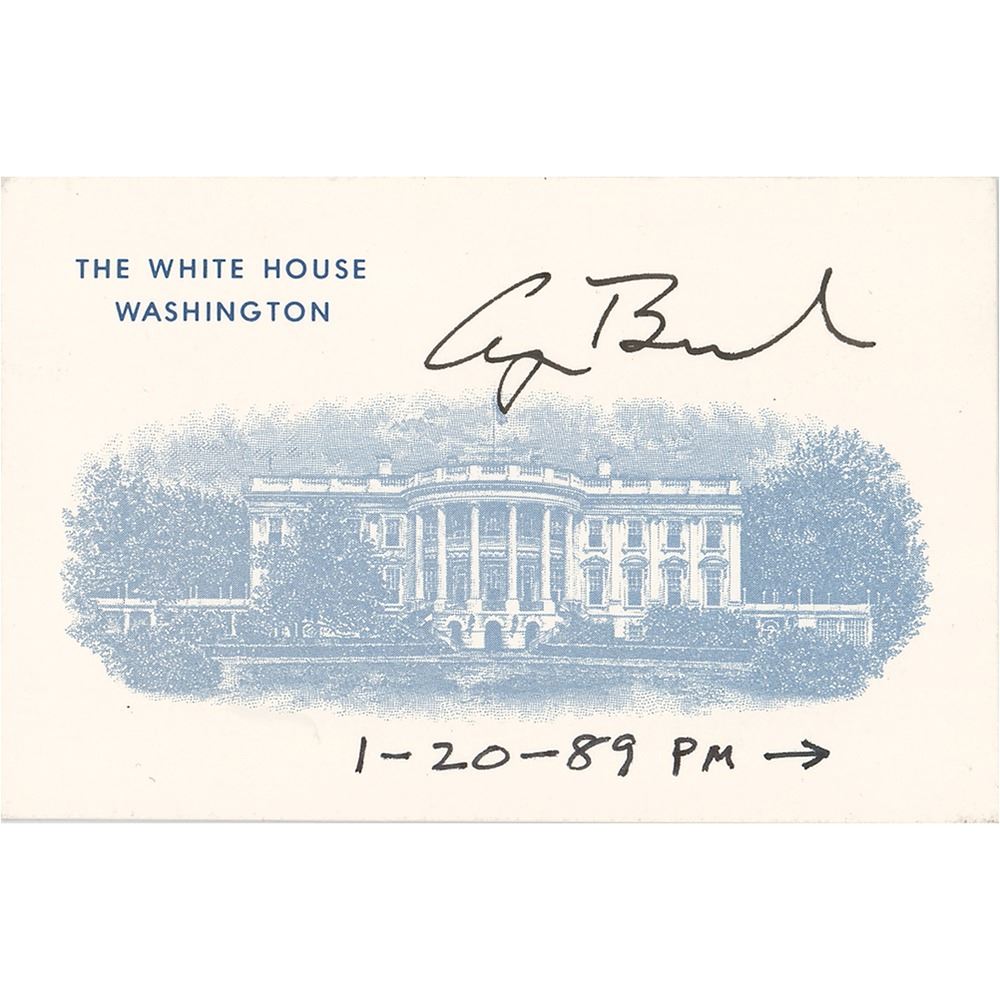 Official White House card featuring a vignette of the executive mansion, 3.75 x 2.5, boldly signed in black ink by George Bush, and annotated along the bottom in another hand with the date of his inauguration as president. In very fine condition.