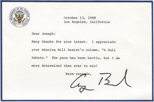 George Bush typed letter signed during his 1988 Presidential campaign. Dated 13 October 1988 and composed on official Vice Presidential seal note card, Bush writes to former Hearst newspaper editor Joseph Kingsbury-Smith regarding his debates with Dukakis. In part: “...Many thanks for your latest. I appreciate your sharing Bill Hearst’s column, 'A Dull Debate.' The pace has been hectic, but I am more determined than ever to win! Warm regards George Bush.” Measures 6.5” x 4.25”. Secretarial pencil marks to verso. Excellent condition.