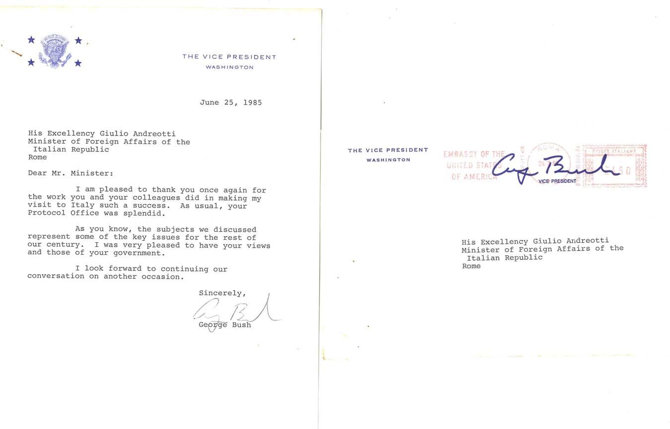 George Bush typed letter signed upon official Vice Presidential letterhead, dated 25 June 1985. Here, Bush thanks Giulio Andreotti, the Italian Minister of Foreign Affairs, for Bush's trip to Italy, ''...As usual, your Protocol Office was splendid. As you know, the subjects we discussed represent some of the key issues for the rest of our century. I was very pleased to have your views...'' 7'' x 9'' letter in near fine condition with one fold and stray rust mark. Accompanied by original mailing envelope.