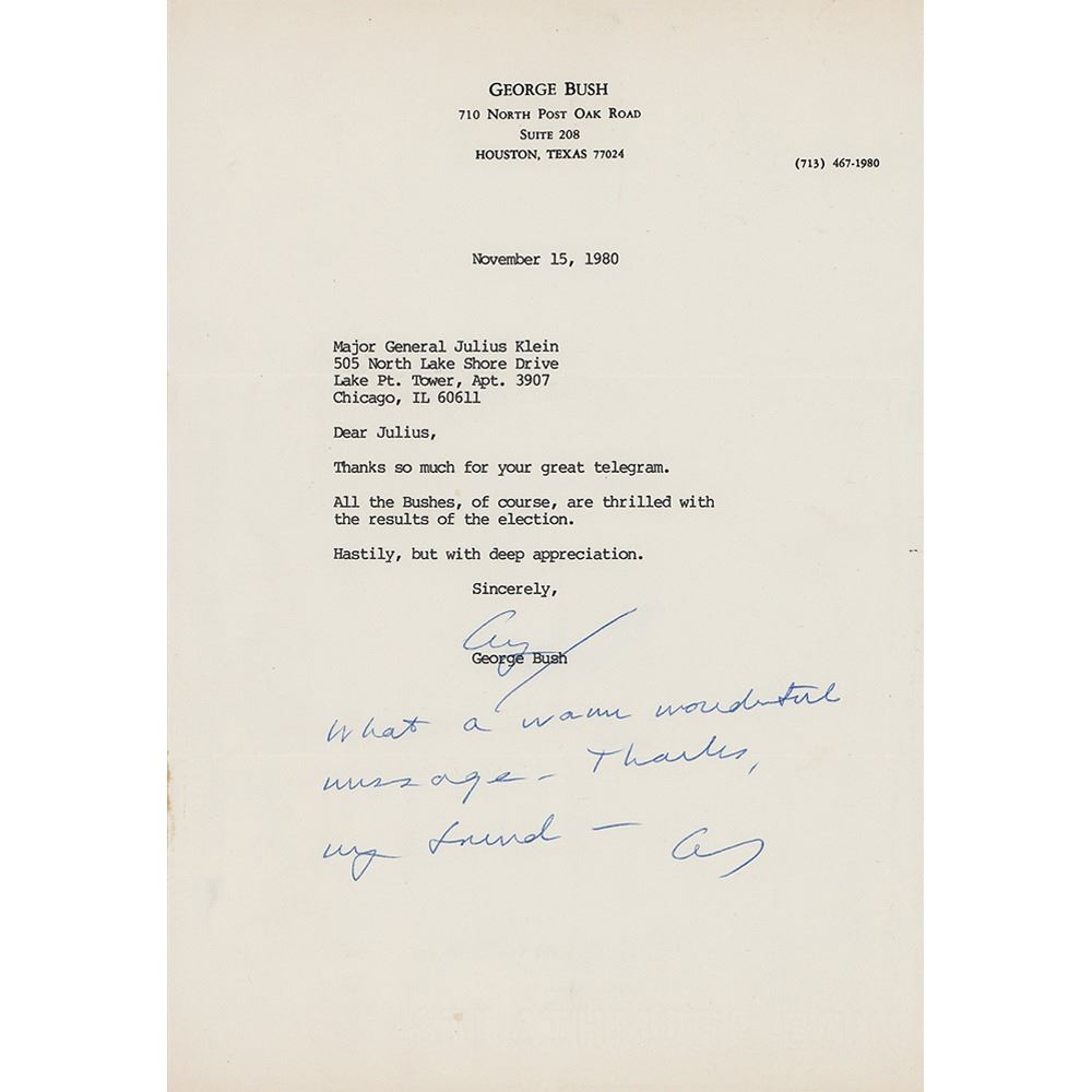 TLS as vice president-elect, signed “George,” one page, 7.25 x 10.5, personal letterhead, November 15, 1980. Letter to Major General Julius Klein regarding his recent election as U.S. Vice President, in full: “Thanks so much for your great telegram. All the Bushes, of course, are thrilled with the results of the election. Hastily, but with deep appreciation ” Bush adds a handwritten postscript: “What a warm wonderful message. Thanks, my friend – George.” In fine condition. Bush wrote this letter 11 days after he was elected as U.S. Vice President under Ronald Reagan. General Julius Klein (1901-84) the letter recipient, served as National Commander of the Jewish War Veterans of the U.S.A., and originated the South Pacific edition of ‘Stars and Stripes’ magazine.