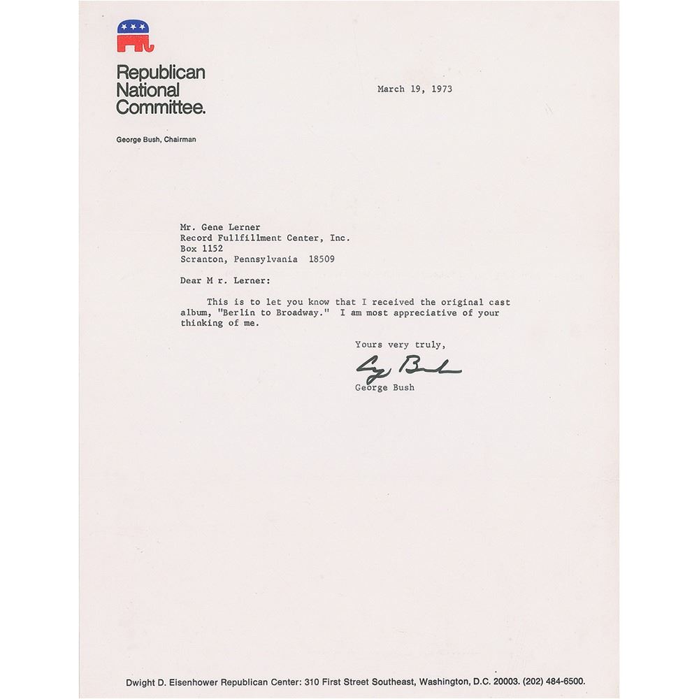 TLS, one page, 8.5 x 11, Republican National Committee letterhead, March 19, 1973. Letter to Gene Lerner of the Record Fulfillment Center, in full: "This is to let you know that I received the original cast album, 'Berlin to Broadway.' I am most appreciative of your thinking of me." In fine condition. Bush was then serving as chair of the Republican National Committee, a post he held until September 1974, when he became chief of the U.S. Liaison Office to the People's Republic of China.