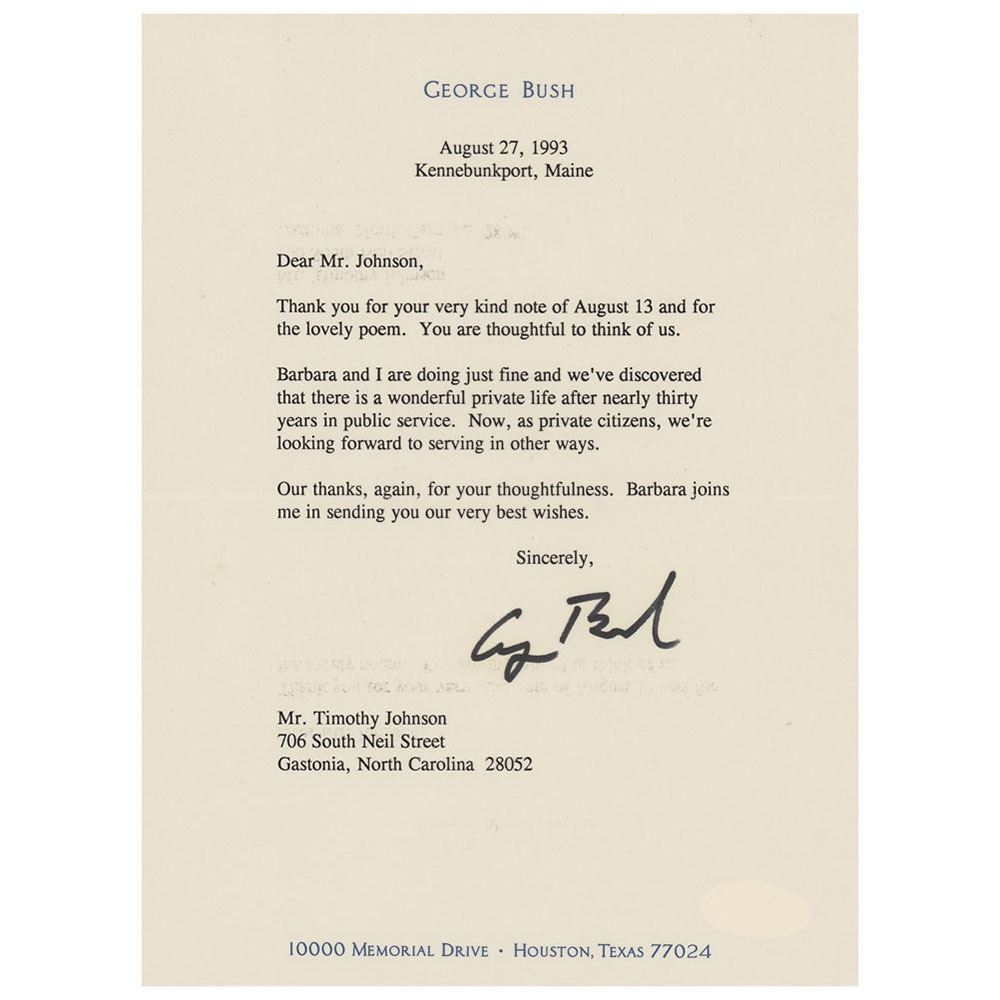 TLS, one page, 6.25 x 8.5, personal letterhead, August 27, 1993. Letter to Timothy Johnson, in part: "Barbara and I are doing just fine and we've discovered that there is a wonderful private life after nearly thirty years in public service. Now, as private citizens, we're looking forward to serving in other ways." In fine condition, with light show-through from a JSA sticker on the reverse. Accompanied by a certificate of authenticity from JSA.