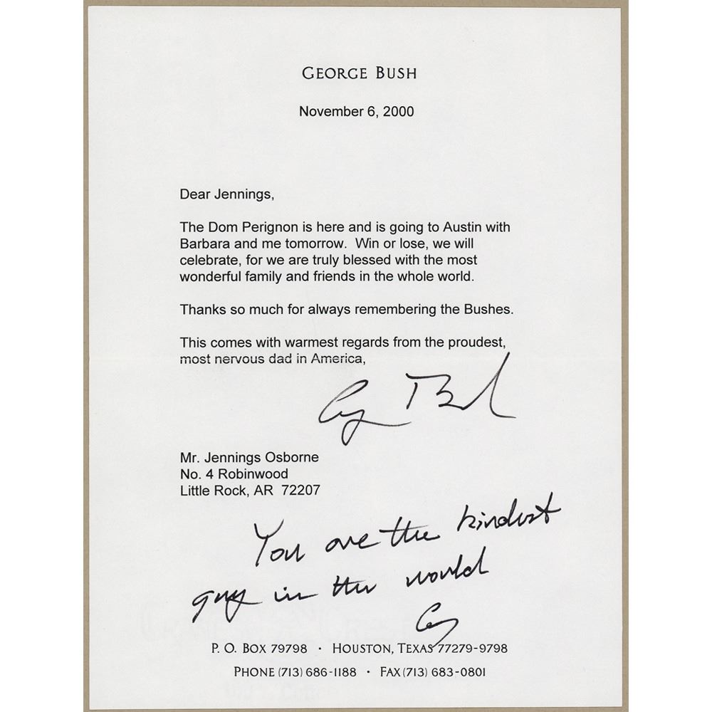 TLS signed "George Bush," one page, 6.25 x 8.5, personal letterhead, November 6, 2000. Letter to Little Rock philanthropist Jennings Osborne, sent on the day before the 2000 Bush vs. Gore election. In full: "The Dom Perignon is here and is going to Austin with Barbara and me tomorrow. Win or lose, we will celebrate, for we are truly blessed with the most wonderful family and friends in the whole world. Thanks so much for always remembering the Bushes. This comes with warmest regards from the proudest, most nervous dad in America." He adds a handwritten postscript, signed "George," in full: "You are the kindest guy in the world." In fine condition.