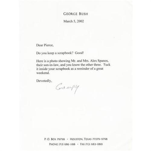 <B>George Bush Typed Letter Signed</B></I> “<I>Gampy,</B></I>” one page, 6.5” x 8.5”. Houston, Texas, March 5, 2002. To his grandson, Pierce Bush. In full, “<I>Do you keep a scrapbook? Good! Here is a photo showing Mr. and Mrs. Alex Spanos, their son-in-law, and you know the other three. Tuck it inside your scrapbook as a reminder of a great weekend. Devotedly.</B></I>” Pierce turned 16 on March 15, 2002. “Pierce” is his grandmother Barbara Bush's maiden name. He is one of three children of Neil and Sharon Bush, their middle child and only son. Alex Spanos owns the NFL San Diego Chargers and is a major contributor to the Republican Party. Minor crease in lower right corner. Never folded. Very fine condition. <I>From the personal collection of Sharon Bush and accompanied by a signed Letter of Authenticity from her</B></I>.<BR><BR><BR><b>Shipping:</b> Flat Material, Small (<a target="_blank" href="http://www.heritageauctions.com/common/shipping.php">view shipping information</a>)