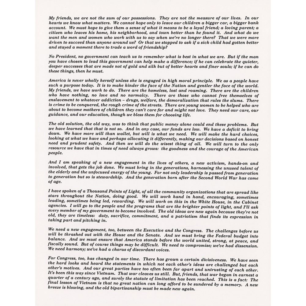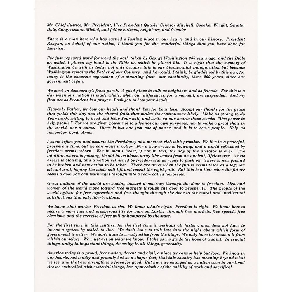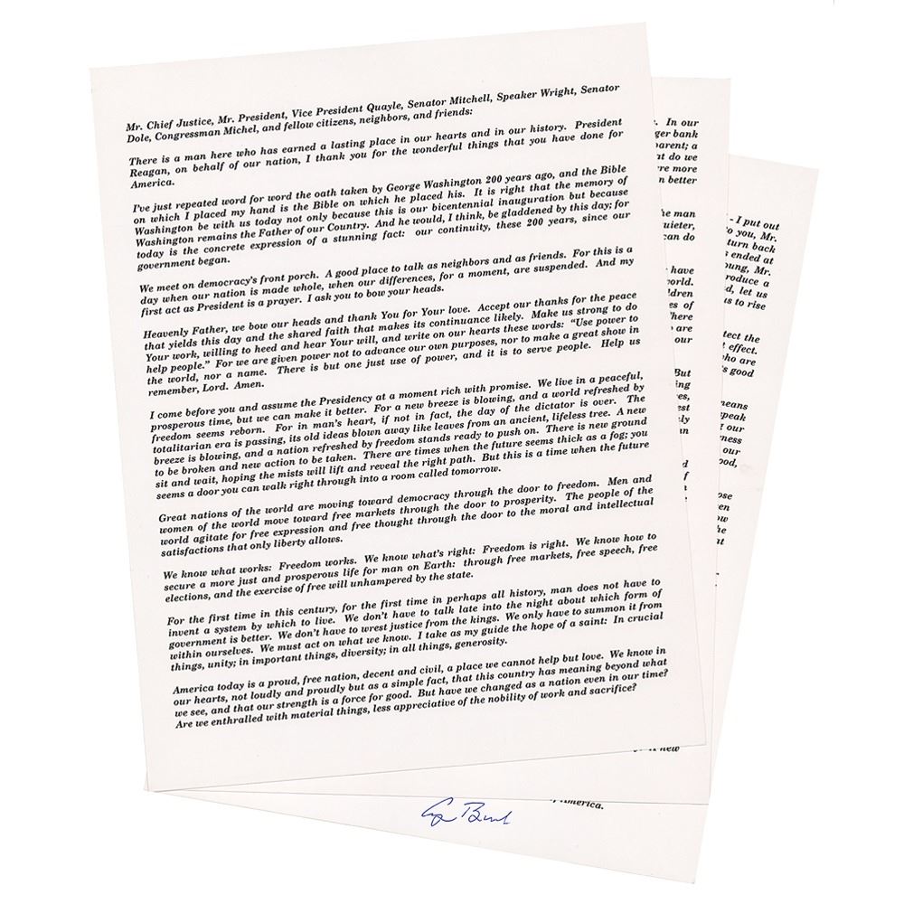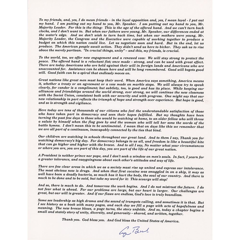 TQS, three pages, 10 x 13, signed at the conclusion in blue ballpoint, "George Bush." Interesting oversized typescript of Bush's inaugural address, given on January 20, 1989, in part: "I have just repeated word for word the oath taken by George Washington 200 years ago, and the Bible on which I placed my hand is the Bible on which he placed his. It is right that the memory of Washington be with us today, not only because this is our Bicentennial Inauguration, but because Washington remains the Father of our Country. And he would, I think, be gladdened by this day; for today is the concrete expression of a stunning fact: our continuity these 200 years since our government began." In very fine condition.