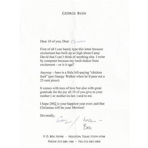 <B>George Bush and Barbara Bush Typed Letter Signed</B></I> “<I>George</B></I>” and “<I>Love/Bar,</B></I>” one page, 6.25” x 8.5”. Houston, Texas, c. December 2001. With original 9.5” x 4” envelope with Bush Houston address on the back flap. Bush has penned “<I>Sharon</B></I>” on the front. Begins “<I>Dear 10 of you, Dear</B></I>” to which George Bush has penned “<I>Sharon.</B></I>” In full, “<I>First of all I can barely type this letter because excitement had built up so high about Camp David that I can't think of anything else. I write by computer because my hand shakes from excitement or is it age? Anyway - here is a little bill-paying 'chicken feed' (per Gampy Walker when he'd pass out a 25 cent piece). It comes with tons of love but also with great gratitude for the joy all 10 of you give to your mother (or mother-in-law) and to me. I hope 2002 is your happiest year ever; and that Christmas will be your Merriest! Devotedly.</B></I>” This letter was one of ten individually sent to their children, George, Jeb, Neil, Marvin, and Dorothy, and their spouses. Gampy Walker was the father of George's mother Dorothy, stockbroker George Herbert Walker (1875-1953). When George and Barbara Bush were in The White House, their children and grandchildren would visit them at Camp David at Christmastime. This was their son's first Christmas as President and George Bush was excited about returning to Camp David after eight years. 2002 was not Sharon's happiest year ever. Her husband Neil told her he wanted a divorce. They were separated in 2002 and divorced in 2003. Very fine condition. <I>From the personal collection of Sharon Bush and accompanied by a signed Letter of Authenticity from her</B></I>.<BR><BR><BR><b>Shipping:</b> Flat Material, Small (<a target="_blank" href="http://www.heritageauctions.com/common/shipping.php">view shipping information</a>)
