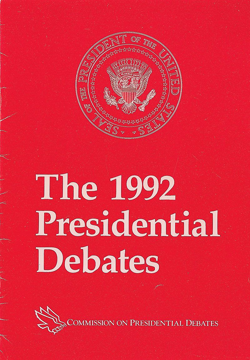 Uncommon program for the second 1992 Presidential Debate, held at the University of Richmond on October 15, 7 x 10, signed in ballpoint on the title page by George Bush, Bill Clinton, and Barbara Bush. Also bears a presentation inscription on the preceding page by L. Douglas Wilder, then-governor of Virginia. In overall fine condition, with scattered light creases to covers. This was the first-ever presidential debate conducted in a ‘town hall’ format, and the 1992 series of debates was also unusual in that three candidates were invited, with Ross Perot joining Bush and Clinton on the nationally televised stage.
