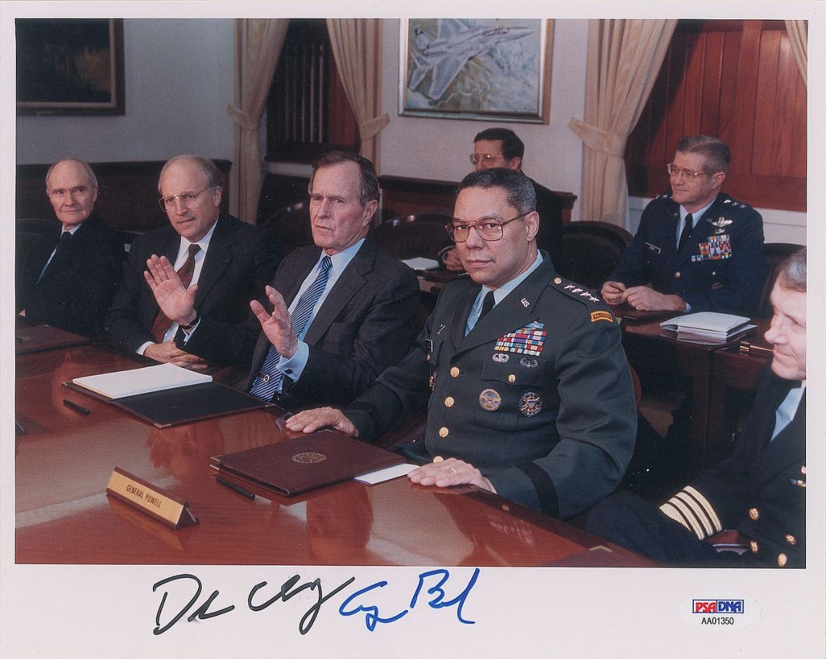 Color glossy 10 x 8 photo of George Bush sitting with Dick Cheney and Colin Powell, signed in the lower border in blue felt tip by Bush, and in black felt tip by Cheney. In fine condition. Accompanied by a full letter of authenticity from PSA/DNA.